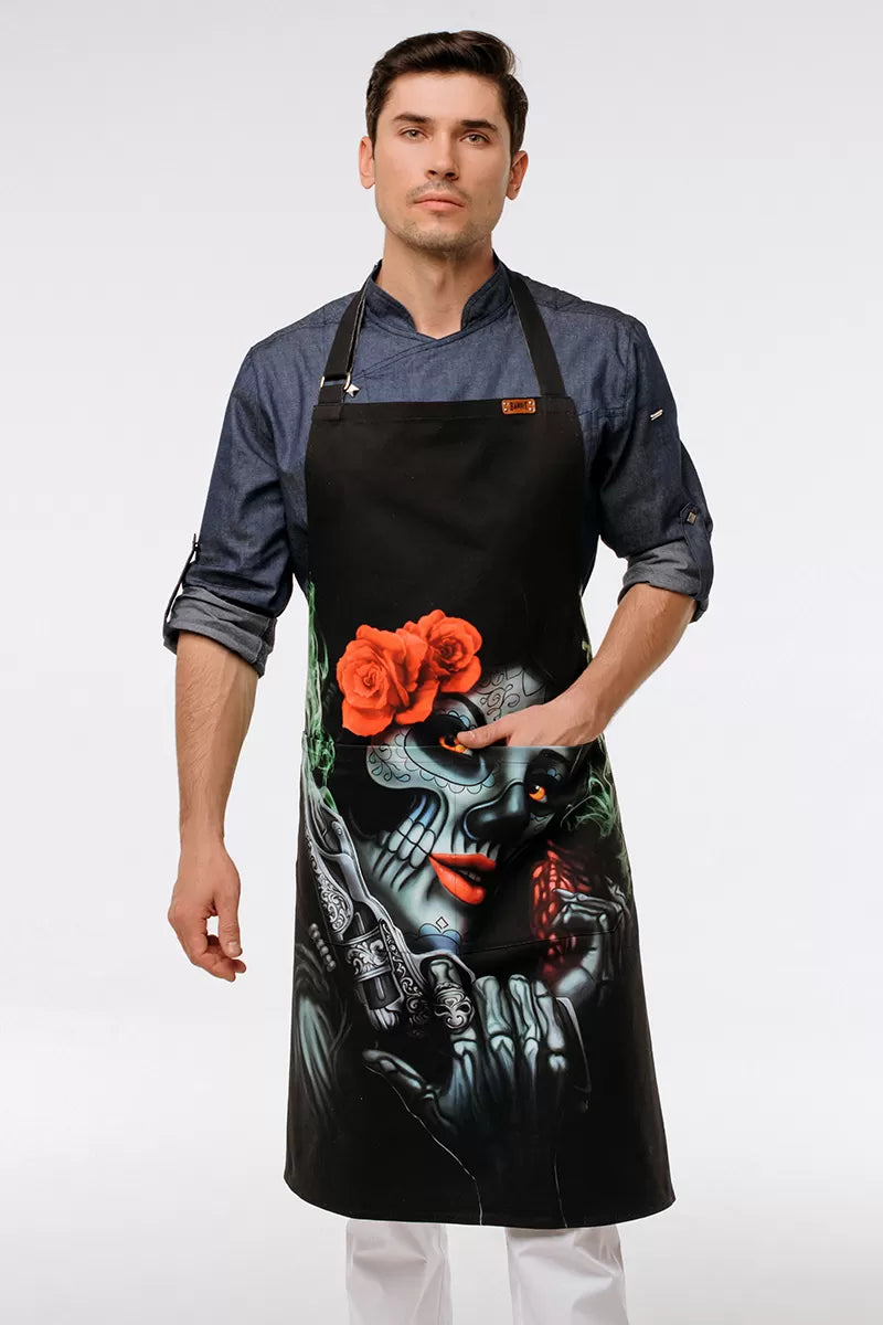 Comfortable chef's apron with an adjustable neck strap, made from natural Indian cotton. Its distinguishing feature is a stylish author's print depicting Death herself in disguise of the beautiful Calavera Katrina.